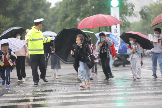 5月19日下午,安徽省舒城縣降雨并伴有霧天氣,舒城縣公安局交通管理大隊在學校周邊增派“護學崗”警力,確保學生出行安全。圖為該大隊二中隊“護學崗”輔警在轄區(qū)一學校附近呵護放學小學生安全過馬路。
