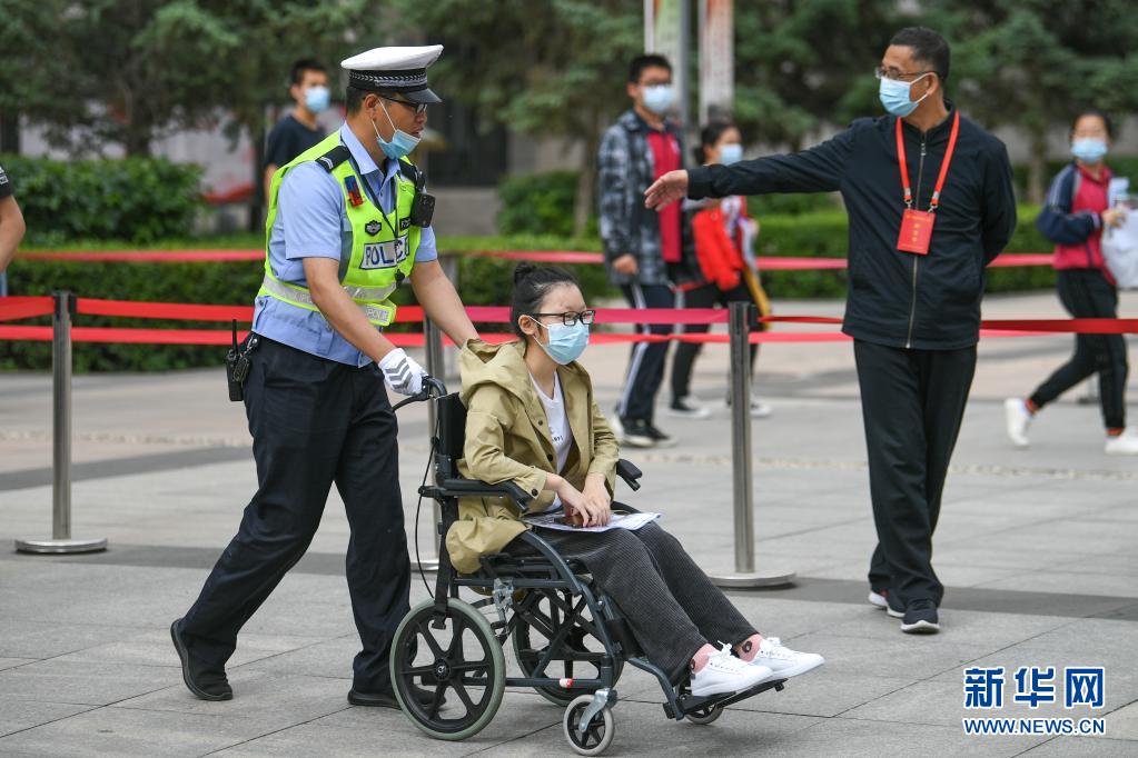 6月7日,交警幫助行動不便的考生進入內蒙古呼和浩特市第二中學(西校區(qū))考點。