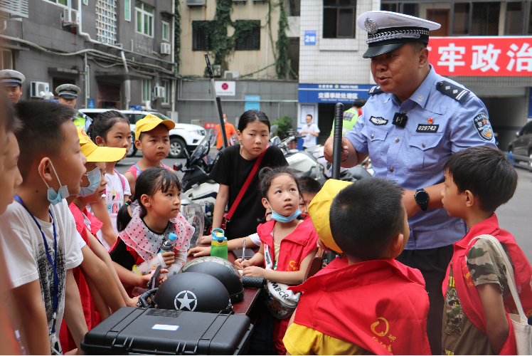 為做好暑期道路交通安全宣傳工作,增強(qiáng)未成年人的交通安全意識(shí),7月14日上午,四川省綿陽(yáng)市公安局交警支隊(duì)直屬一大隊(duì)組織本地報(bào)社的“小記者”們到大隊(duì)參觀、采訪?;顒?dòng)中,民警向“小記者”們介紹交警工作,講解交通安全知識(shí),還為他們展示酒精測(cè)試儀、防暴盾牌、臂盾等執(zhí)法裝備,并進(jìn)行現(xiàn)場(chǎng)演示。圖為民警與“小記者”互動(dòng)。