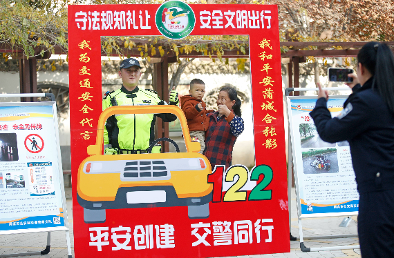 11月24日,陜西省蒲城縣公安局交通管理大隊組織民警深入東街社區(qū),開展“守法規(guī)知禮讓 安全文明出行”第十個全國交通安全日主題宣傳活動,通過案例視頻警示教育、酒駕危害宣傳、指揮手勢演示以及“我和平安蒲城合張影”等活動,向社區(qū)居民普及交通安全知識。圖為民警和居民一起參加“我和平安蒲城合張影”活動。