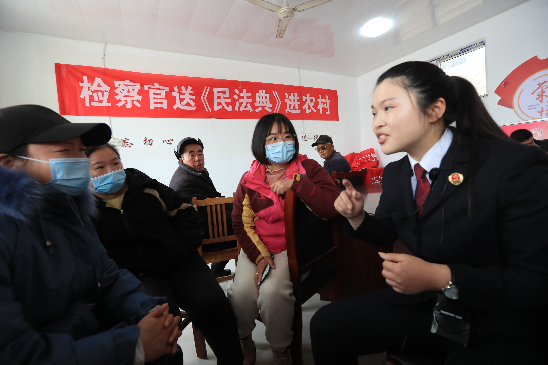 “我能把宅基地賣給城里的堂哥嗎?”“宅基地的房子為啥不能辦抵押貸款?”11月29日,山東省聊城市人民檢察院檢察官走進(jìn)“鄉(xiāng)村振興”幫扶村——高新區(qū)許營鎮(zhèn)龍匯新村,圍繞土地承包經(jīng)營權(quán)、宅基地使用權(quán)等農(nóng)民權(quán)益保障熱點(diǎn)問題,依據(jù)民法典現(xiàn)場解答村民疑問并發(fā)放宣傳資料。圖為檢察官為村民講解相關(guān)法律知識。
