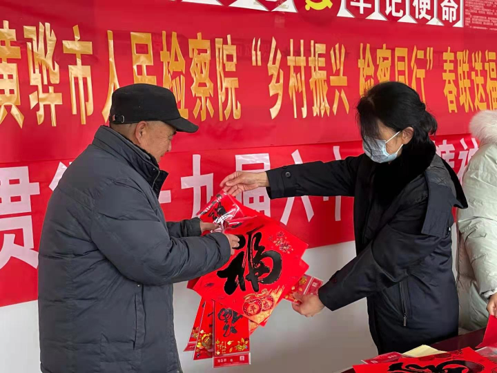 近日,河北省黃驊市人民檢察院干警來到羊三木回族鄉(xiāng)三虎莊村,開展“鄉(xiāng)村振興·檢察同行”春聯(lián)送福活動。該院已連續(xù)多年開展送福活動,為農村精神文明建設貢獻檢察力量。圖為檢察干警向村民贈送春聯(lián)。 本報記者 周宵鵬 本報通訊員 李宴俊 攝