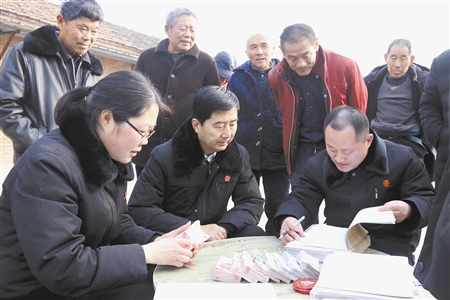 圖①:法官在核對農(nóng)戶身份信息,準(zhǔn)備發(fā)放土地租賃費(fèi)。