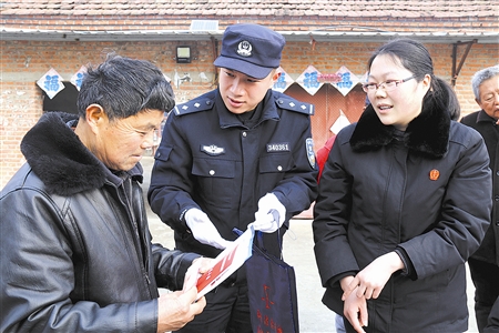 圖③:法庭干警向農(nóng)戶發(fā)放普法宣傳資料。