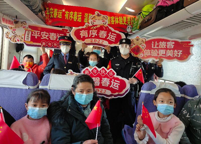 春運(yùn)以來,烏魯木齊鐵路公安局庫(kù)爾勒公安處乘警支隊(duì)民警用情用心,認(rèn)真落實(shí)消防、安檢職責(zé),維護(hù)好列車秩序,為廣大旅客營(yíng)造一個(gè)安全、溫馨的乘車環(huán)境。圖為近日,由喀什發(fā)往成都的k454次列車車廂里,乘警帶領(lǐng)列車工作人員和乘客一起開展春運(yùn)安全倡議活動(dòng)。