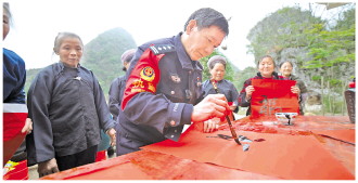 圖為李軍與村民一起寫(xiě)福字過(guò)新年。 程睿哲 攝
