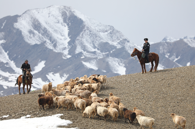 近日,隨著氣溫逐步回暖,新疆維吾爾自治區(qū)阿勒泰地區(qū)青河縣的牧民們都陸續(xù)開始了轉(zhuǎn)場作業(yè)。連日來,阿勒泰邊境管理支隊青河邊境管理大隊阿尕什敖包邊境派出所選派騎馬經(jīng)驗豐富的民警成立“牧羊人”小分隊,深入邊境轄區(qū)幫助牧民們共同放牧,全力保障牧民轉(zhuǎn)場的順利進(jìn)行。圖為民警助力牧民轉(zhuǎn)場。