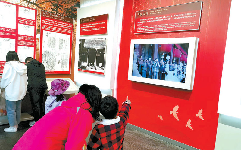 展覽當(dāng)中的一段開國大典的影像資料讓游客們紛紛駐足?!爸腥A人民共和國中央人民政府今天成立了!”聽到錄音里毛主席的這段莊嚴(yán)宣告,游客們不由地挺直了腰桿。
