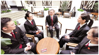圖為殷傳茂(左三)組織合議庭及法官助理討論案件。 大連市中級(jí)人民法院供圖