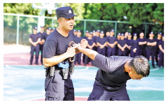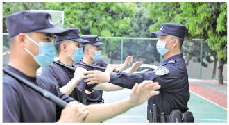 圖① 符豪(左)正在向民警教授警務(wù)實戰(zhàn)技能。