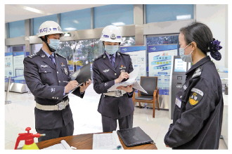 圖② 陳瑛(中)在上虞公安便民分中心督查“守小門(mén)”防疫工作開(kāi)展落實(shí)情況。