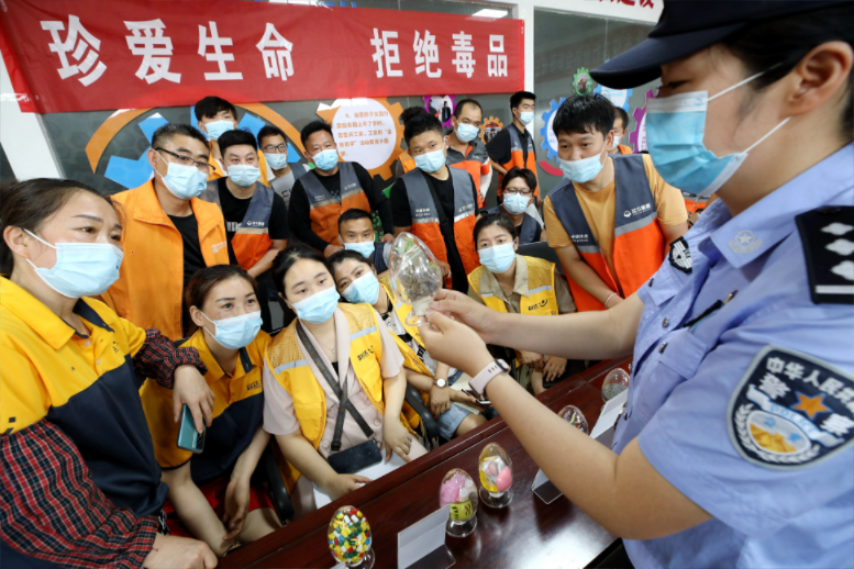 6月22日,安徽省淮北市總工會(huì)聯(lián)合淮北市公安局相山分局西區(qū)派出所開展禁毒宣傳走進(jìn)物流園區(qū)活動(dòng),現(xiàn)場(chǎng)通過仿真毒品展示、發(fā)放宣傳單、承諾簽名等形式,向物流從業(yè)人員宣傳毒品種類、毒品辨別、毒品危害等知識(shí),倡導(dǎo)遠(yuǎn)離毒品健康生活。圖為民警向物流從業(yè)人員宣傳禁毒知識(shí)。