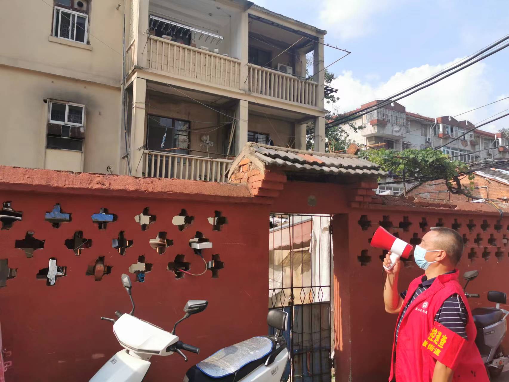 圖為李煒建在小區(qū)宣傳疫情防控政策。 余娜 攝