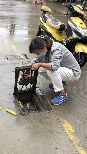 圖為吳錦瑾在清理下水管道。 徐新民 攝
