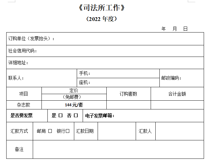 單位匯款時請務必標明“司法所工作+訂購套數(shù)”,個人匯款請務必注明“單位名稱+中國司法”。