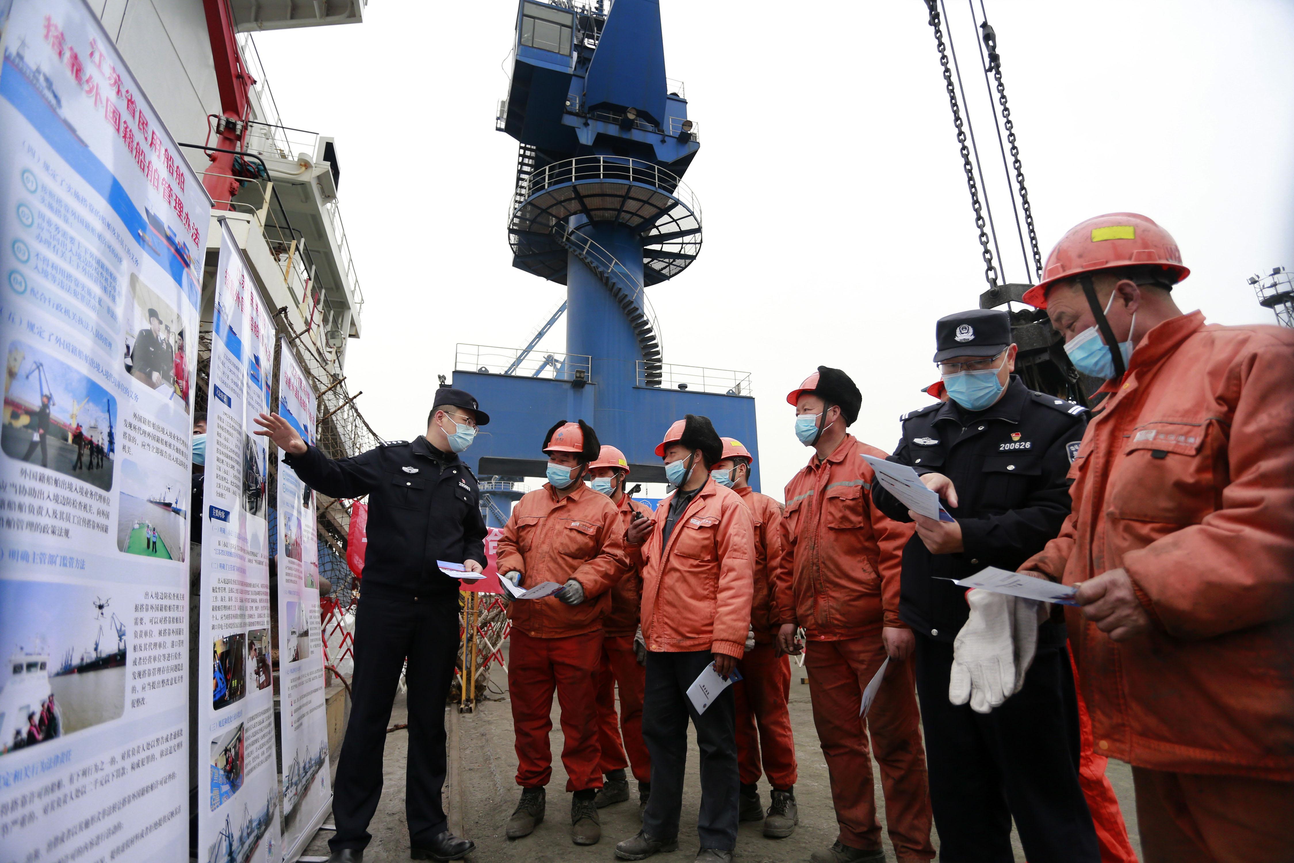 《江蘇省民用船舶搭靠外國籍船舶管理辦法》將于4月1日起施行。2月23日,江蘇南京港出入境邊防檢查站組織普法小分隊深入港口船企和碼頭,開展普法宣傳活動。圖為普法小分隊成員向碼頭工人普及新規(guī)。 本報通訊員 張光偉 章善玉 攝