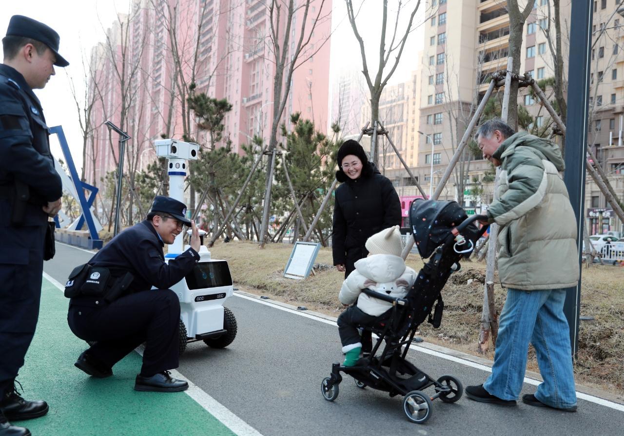 近日,位于山東省煙臺(tái)市高新技術(shù)產(chǎn)業(yè)開發(fā)區(qū)的科教基地警務(wù)站正式啟用,警務(wù)站融合了派出所、特巡警等多警種力量,配置無人機(jī)、巡邏機(jī)器人、多功能自助服務(wù)一體機(jī)等,24小時(shí)全天候開展治安管控和便民服務(wù)。圖為警務(wù)站民輔警和巡邏機(jī)器人共同巡邏時(shí),與轄區(qū)群眾互動(dòng)。