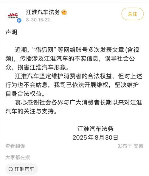 而在前一天的8月30日,@江淮汽車法務(wù)發(fā)布聲明:近期,“獵狐網(wǎng)”等網(wǎng)絡(luò)賬號(hào)多次發(fā)表文章(含視頻),傳播涉及江淮汽車的不實(shí)信息,誤導(dǎo)社會(huì)公眾,損害江淮汽車形象。江淮汽車堅(jiān)定維護(hù)消費(fèi)者的合法權(quán)益,但對(duì)上述行為也不會(huì)姑息,我司已依法開展維權(quán),堅(jiān)決維護(hù)自身合法權(quán)益。