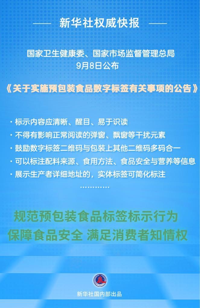 國(guó)家衛(wèi)生健康委、國(guó)家市場(chǎng)監(jiān)督管理總局9月8日公布《關(guān)于實(shí)施預(yù)包裝食品數(shù)字標(biāo)簽有關(guān)事項(xiàng)的公告》。