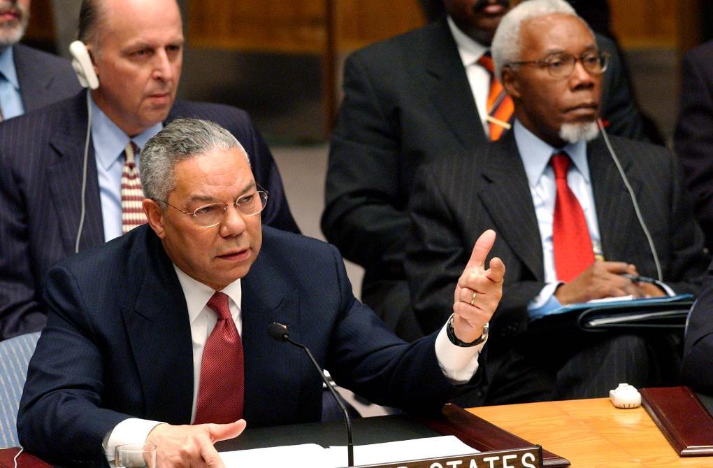 2003年2月5日,時(shí)任美國(guó)國(guó)務(wù)卿鮑威爾在聯(lián)合國(guó)安理會(huì)就伊拉克問(wèn)題舉行的公開(kāi)會(huì)議上向安理會(huì)通報(bào)有關(guān)伊拉克藏匿大規(guī)模殺傷性武器的所謂“證據(jù)”。 新華社記者彭張青攝(數(shù)碼傳真照片)