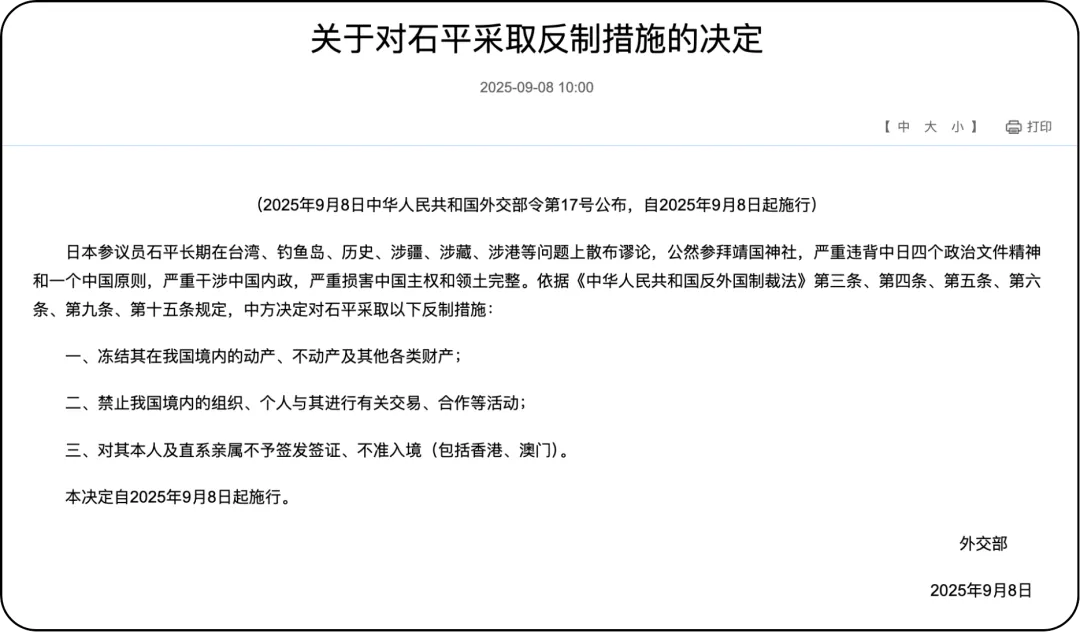 9月8日,中方宣布對日本參議員石平采取反制措施,禁止其進(jìn)入中國境內(nèi),凍結(jié)其在華資產(chǎn),并限制其與中國的商業(yè)往來。