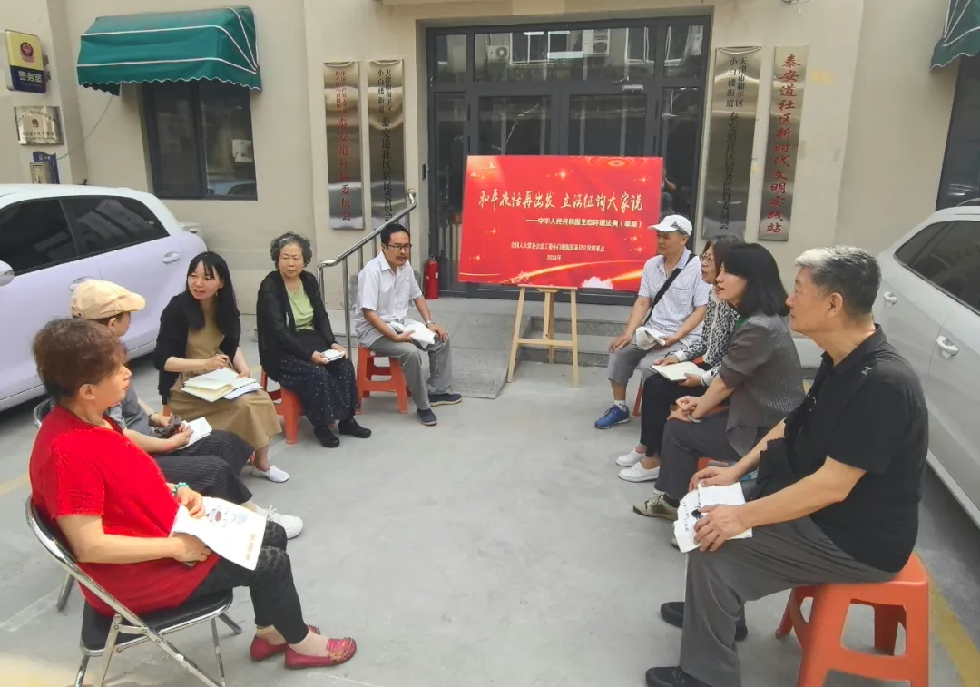“和平夜話再出發(fā),立法征詢大家說”,天津小白樓街道基層立法聯(lián)系點到社區(qū)征集對生態(tài)環(huán)境法典(草案)的意見。(全國人大常委會法工委供圖)