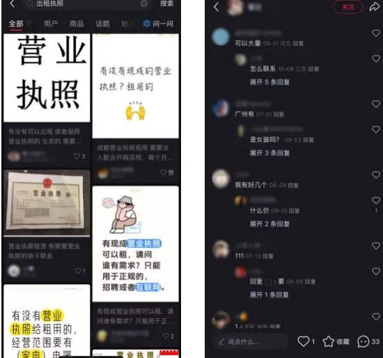 法治網(wǎng)記者在某社交平臺(tái)以“出租執(zhí)照”為關(guān)鍵詞進(jìn)行檢索,瞬間便出現(xiàn)大量相關(guān)信息。此類帖子大多以“閑置營(yíng)業(yè)執(zhí)照出租”為引流點(diǎn),評(píng)論區(qū)中咨詢租賃細(xì)節(jié)、問價(jià)的用戶不在少數(shù)。