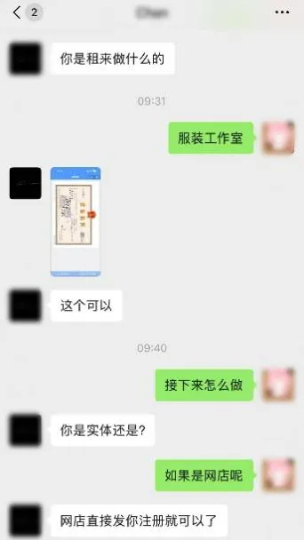 法治網(wǎng)記者以需要注冊(cè)服裝類網(wǎng)店為由添加賣家微信后,對(duì)方在了解用途后,隨即發(fā)來相關(guān)貿(mào)易類公司的營(yíng)業(yè)執(zhí)照,并直言租用后可直接用于網(wǎng)店注冊(cè),全程未對(duì)租用方的情況進(jìn)行了解。
