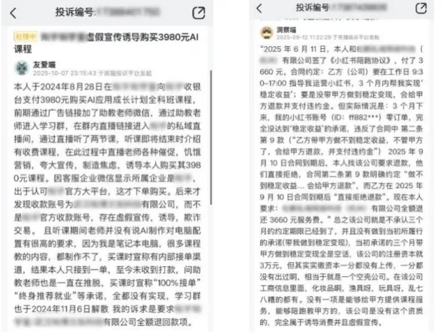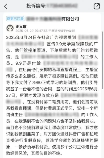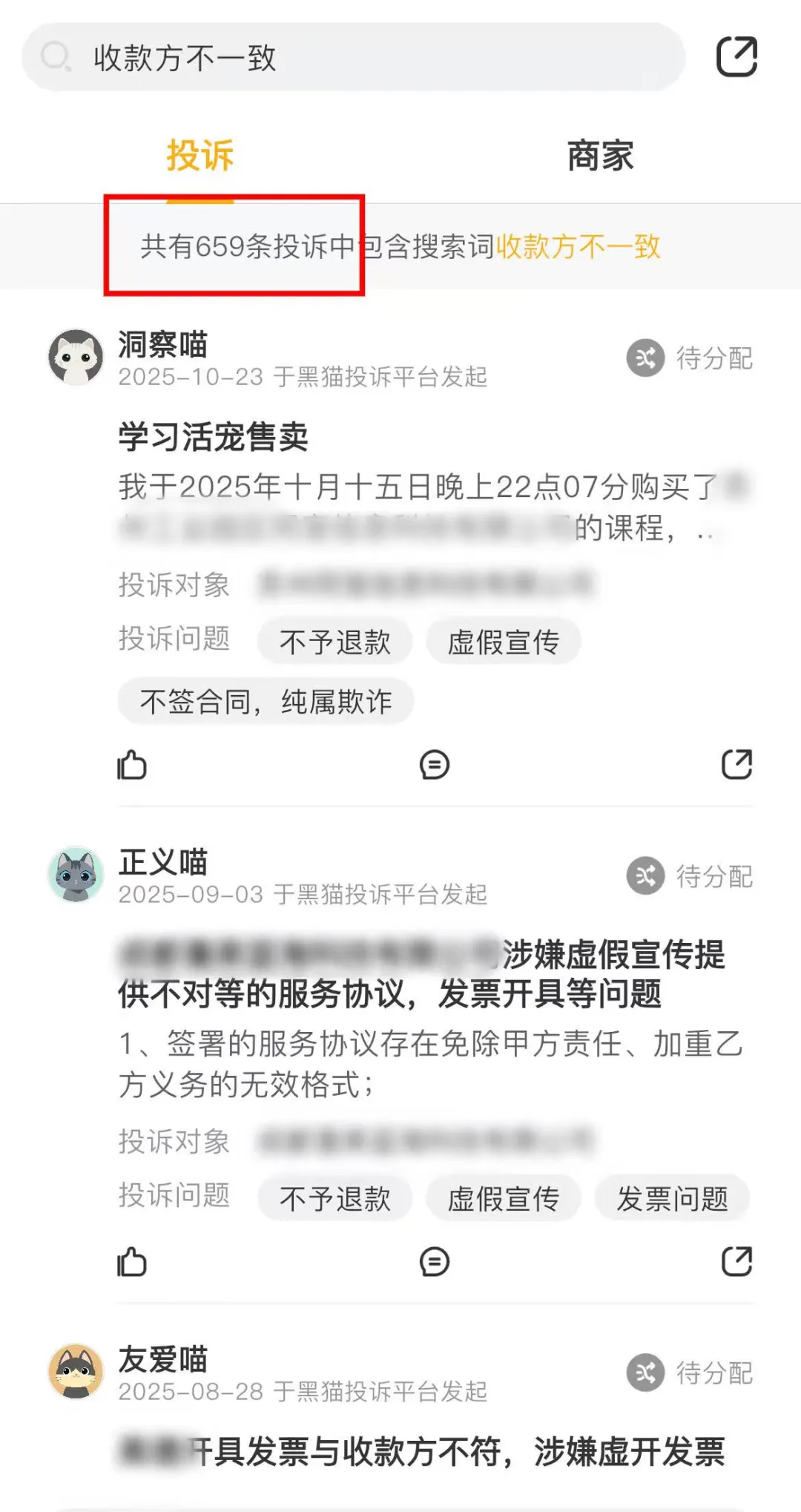 另一位消費(fèi)者則表示,之前看到某知識(shí)付費(fèi)商家宣傳“快速盈利”“100%接單”“終身推薦就業(yè)”承諾,沒想到付款后竟發(fā)現(xiàn)收款主體是陌生企業(yè)而非某知名大平臺(tái);從廣告推廣運(yùn)營(yíng)、前期對(duì)接到9.9元體驗(yàn)課引流以及正式培訓(xùn)費(fèi)收款方,再到后期服務(wù)的班主任,整個(gè)過程竟涉及五家不同公司主體……