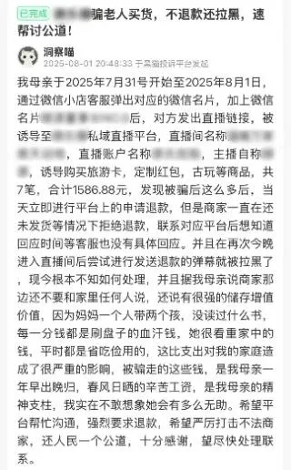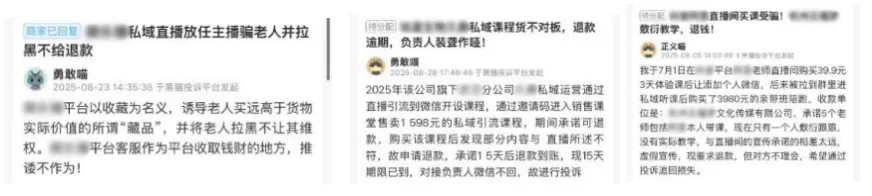 法治網(wǎng)記者注意到,在黑貓投訴平臺(tái)上,直播電商注冊(cè)主體和實(shí)際運(yùn)營(yíng)團(tuán)隊(duì)、收款單位不一致現(xiàn)象尤為突出,有多達(dá)600余條相關(guān)投訴。其中,有消費(fèi)者反映,一些商家在出售產(chǎn)品后即銷聲匿跡;還有的商家注冊(cè)主體、簽約主體和收款單位各不相同,交易涉及多家關(guān)聯(lián)公司。這種“分身術(shù)”式的運(yùn)營(yíng)模式,導(dǎo)致消費(fèi)者在尋求售后時(shí)常常被“踢皮球”,甚至壓根找不到售后,最終面臨被拉黑、維權(quán)無門的困境。