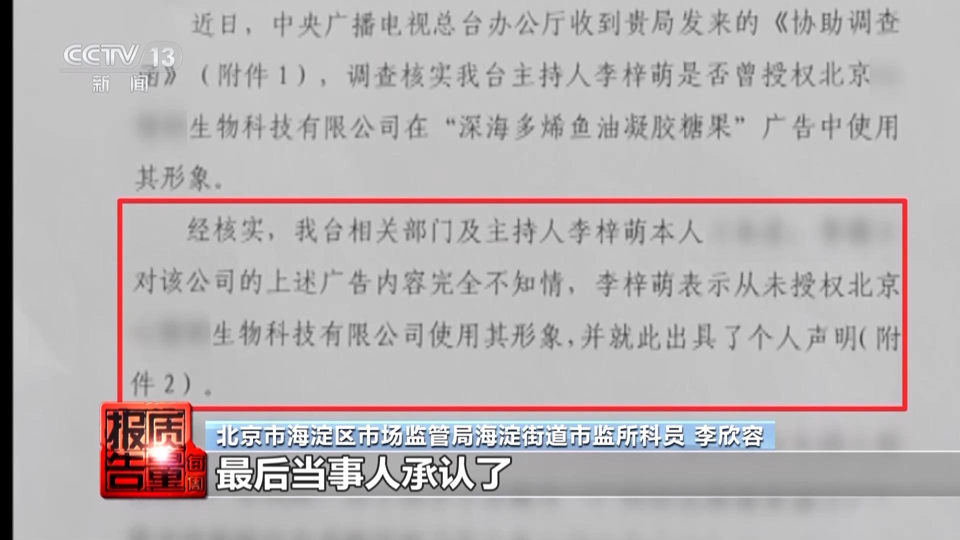 北京市海淀區(qū)市場監(jiān)管部門經(jīng)過向中央廣播電視總臺核實,最終確認,總臺主持人李梓萌從未代言這款魚油產(chǎn)品,也未授權使用其形象進行宣傳。