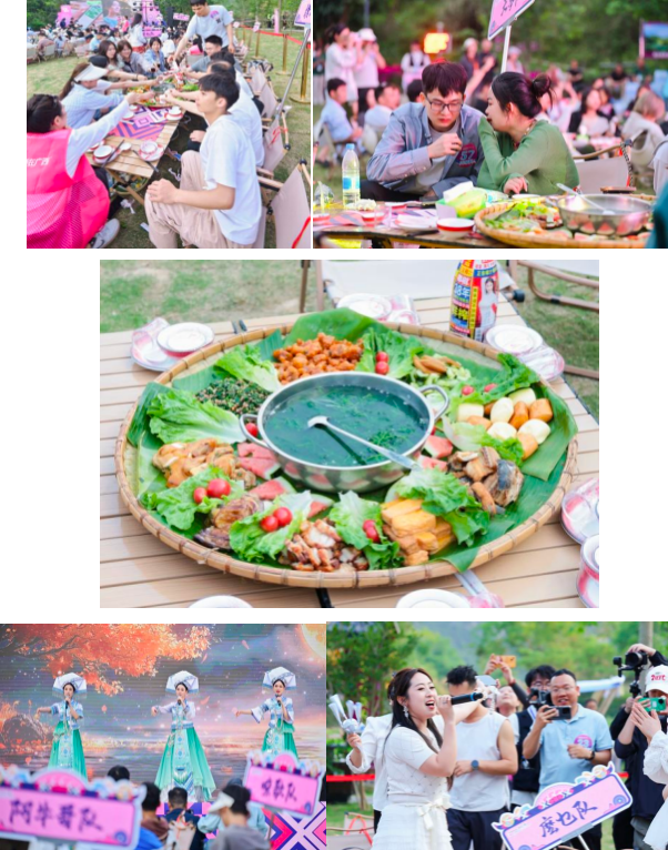 春風(fēng)沉醉的夜晚,“村晚”音樂會暨長桌簸箕宴溫馨開啟。嘉賓們圍坐一堂,共享以自制五色糯米飯為核心的廣西特色美食,在輕柔的音樂中暢談交流。樂隊登臺演繹青春浪漫經(jīng)典曲目,點燃現(xiàn)場氛圍。