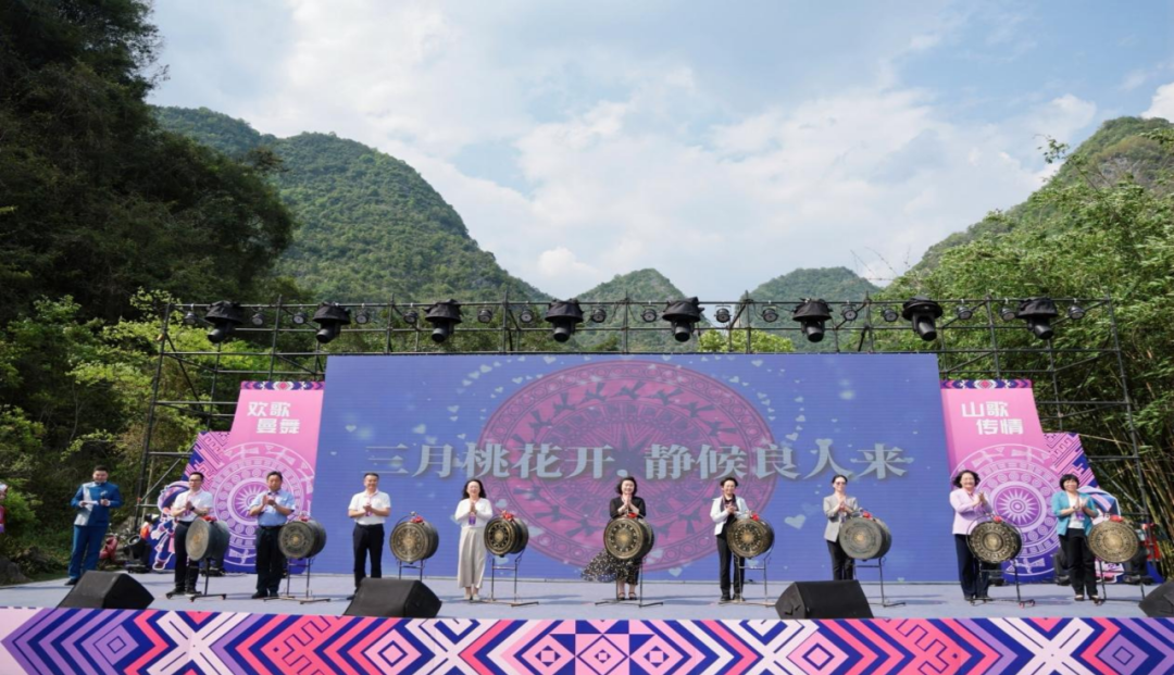 “愿你們遇見那個愿意陪你春耕秋收的人,讓愛情在民族文化的沃土里開出絢爛的花。”視頻祝福環(huán)節(jié)中,廣西各地“幸福聯(lián)線”婚戀交友活動的精彩瞬間徐徐展開,最美家庭代表、公益紅娘及牽手成功的情侶們送上真摯祝福。百色市領(lǐng)導(dǎo)致辭送上美好期許,廣西婦聯(lián)主席為公益紅娘發(fā)放服務(wù)包。隨著全國婦聯(lián)、農(nóng)業(yè)農(nóng)村部、民政部等相關(guān)領(lǐng)導(dǎo)共同敲響銅鼓,“幸福聯(lián)線?愛在廣西?緣定三月三”鄉(xiāng)村交友聯(lián)誼全國示范活動正式啟動。