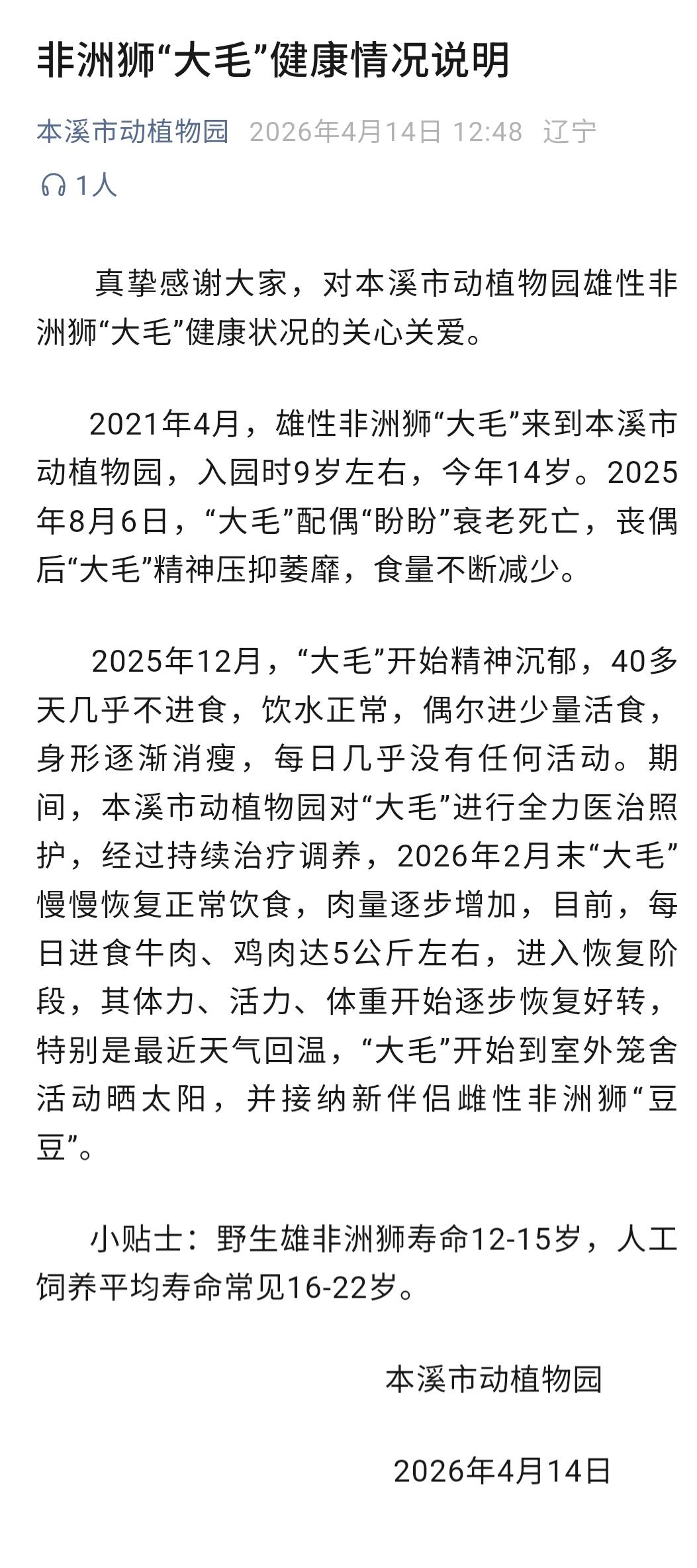 2021年4月,雄性非洲獅“大毛”來到本溪市動(dòng)植物園,入園時(shí)9歲左右,今年14歲。2025年8月6日,“大毛”配偶“盼盼”衰老死亡,喪偶后“大毛”精神壓抑萎靡,食量不斷減少。