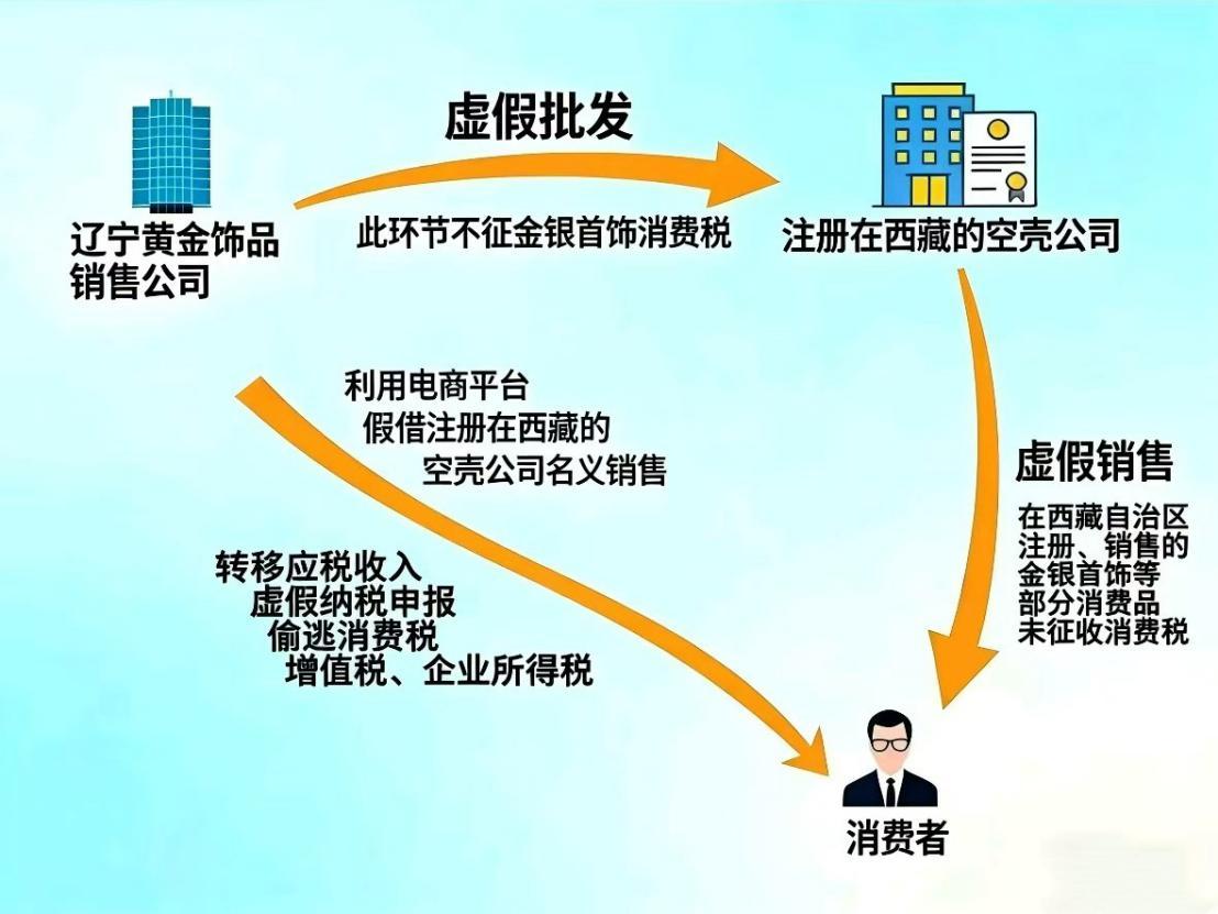 至此,潮尊公司的違法鏈條徹底現(xiàn)形:潮尊公司在沈陽的金銀珠寶城215室通過直播零售黃金,并直接從沈陽發(fā)貨給消費(fèi)者。完成銷售后,卻將收入以“批發(fā)”名義開票至注冊(cè)在西藏的4戶空殼公司,利用后者的身份進(jìn)行(免稅)申報(bào),從而偷逃本應(yīng)在沈陽繳納的消費(fèi)稅。