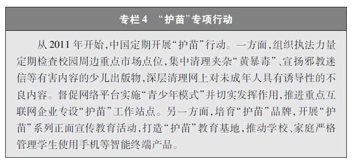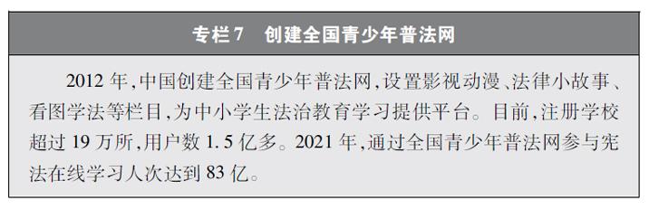 加強(qiáng)青少年網(wǎng)絡(luò)法治宣傳教育。青少年是祖國(guó)的未來(lái)、民族的希望。青少年網(wǎng)民在中國(guó)網(wǎng)民中的占比逐步增長(zhǎng)。作為互聯(lián)網(wǎng)的“原住民”,青少年是網(wǎng)上學(xué)習(xí)、交流、生活最活躍的參與者、實(shí)踐者,其合法權(quán)益也更易受到網(wǎng)絡(luò)違法活動(dòng)的侵害。中國(guó)從保護(hù)青少年網(wǎng)絡(luò)權(quán)益,促進(jìn)青少年健康成長(zhǎng)、全面發(fā)展出發(fā),遵循青少年身心發(fā)展規(guī)律,貼近青少年學(xué)習(xí)生活實(shí)際,聚焦網(wǎng)絡(luò)沉迷、網(wǎng)絡(luò)欺凌、網(wǎng)絡(luò)淫穢色情信息等重點(diǎn)問(wèn)題,通過(guò)普法微綜藝、兒童普法話劇、網(wǎng)絡(luò)普法故事廣播、網(wǎng)絡(luò)普法云課堂、學(xué)法用法知識(shí)競(jìng)賽、法治副校長(zhǎng)進(jìn)校園、編寫網(wǎng)絡(luò)普法讀本等生動(dòng)活潑、豐富多彩的形式開(kāi)展法治宣傳教育,逐步形成了政府、社會(huì)、學(xué)校、家庭相結(jié)合的法治宣傳教育格局,為提升青少年網(wǎng)民法治意識(shí)和網(wǎng)絡(luò)安全素養(yǎng)提供了全面保障。