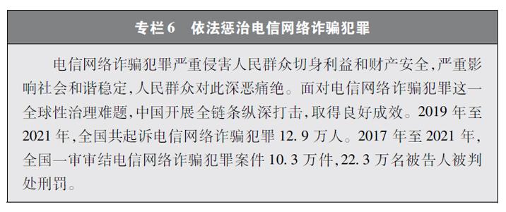 加大網(wǎng)絡(luò)犯罪懲治力度。隨著互聯(lián)網(wǎng)技術(shù)的快速發(fā)展,傳統(tǒng)犯罪加速向以互聯(lián)網(wǎng)為媒介的非接觸式犯罪轉(zhuǎn)變,電信網(wǎng)絡(luò)詐騙、網(wǎng)絡(luò)賭博、網(wǎng)絡(luò)淫穢色情等涉網(wǎng)違法犯罪多發(fā)。中國(guó)依法辦理新型網(wǎng)絡(luò)犯罪案件。連續(xù)多年開(kāi)展“凈網(wǎng)行動(dòng)”,嚴(yán)厲打擊群眾反映強(qiáng)烈的黑客攻擊破壞、侵犯公民個(gè)人信息等違法犯罪活動(dòng)。持續(xù)推進(jìn)“云劍”“斷卡”“斷流”“拔釘”等專項(xiàng)行動(dòng),打擊套路貸、校園貸、“以房養(yǎng)老”、“投資養(yǎng)老”等電信網(wǎng)絡(luò)詐騙犯罪,依法懲處為電信網(wǎng)絡(luò)詐騙犯罪團(tuán)伙提供互聯(lián)網(wǎng)接入、域名注冊(cè)、服務(wù)器托管、移動(dòng)互聯(lián)網(wǎng)應(yīng)用程序制作開(kāi)發(fā)、網(wǎng)絡(luò)支付、引流推廣等服務(wù)支撐的黑灰產(chǎn)業(yè)。完善國(guó)家反詐大數(shù)據(jù)平臺(tái)和反詐移動(dòng)互聯(lián)網(wǎng)應(yīng)用程序,建設(shè)國(guó)家涉詐黑樣本庫(kù),完善快速止付凍結(jié)機(jī)制、涉詐資金返還機(jī)制。堅(jiān)決打擊網(wǎng)絡(luò)賭博犯罪行為,從嚴(yán)治理網(wǎng)絡(luò)淫穢色情。網(wǎng)絡(luò)犯罪治理工作取得明顯成效,人民群眾安全感有效提升,社會(huì)更加和諧穩(wěn)定。