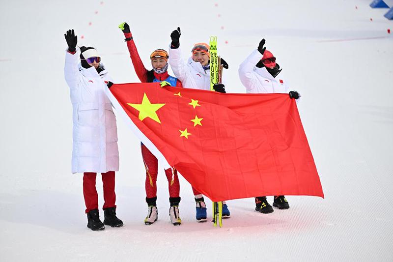 2月13日,中國(guó)隊(duì)選手褚源蒙、孟繁棋、唐佳琳、文穎(從左到右)在賽后慶祝。新華社記者 謝劍飛 攝