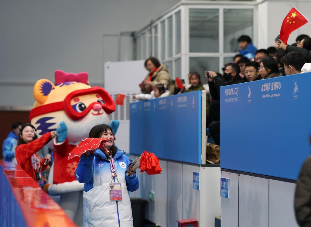 2月11日,志愿者和吉祥物“妮妮”在比賽前與觀眾互動。新華社記者 胡星宇 攝