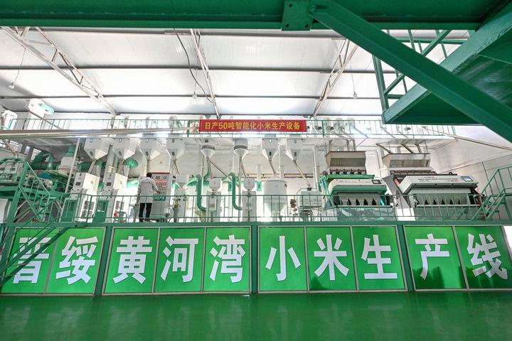 2025年7月1日拍攝的山西省呂梁市興縣晉綏黃河灣農(nóng)業(yè)開(kāi)發(fā)有限公司的小米生產(chǎn)線。抗戰(zhàn)時(shí)期,地處晉西北地區(qū)的興縣和靜樂(lè)縣是晉綏抗日根據(jù)地的一部分。新華社記者 李鑫 攝