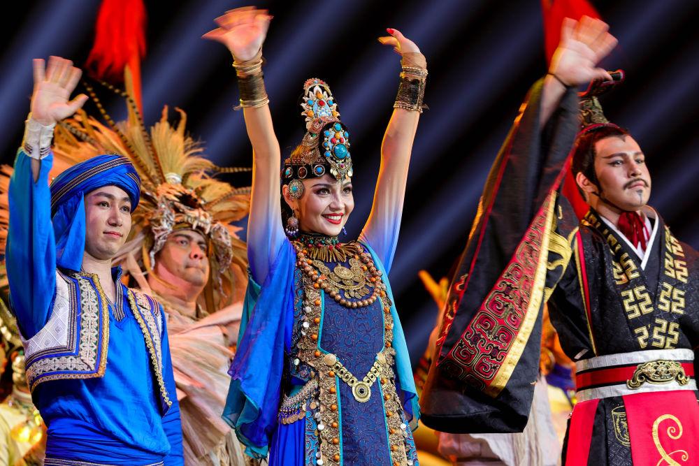 2022年4月22日,在新疆藝術(shù)劇院木卡姆藝術(shù)團(tuán)劇場(chǎng),舞蹈演員馬依熱·艾買提江(中)在舞劇《張騫》演出后向觀眾致謝。馬依熱來自烏魯木齊,11歲時(shí)前往北京跟隨專業(yè)舞蹈老師學(xué)習(xí),學(xué)成后回到家鄉(xiāng),成為新疆藝術(shù)劇院歌舞團(tuán)的一名舞蹈演員。“新疆的歌舞是中華傳統(tǒng)文化的一部分,是用來歌頌美好生活的。希望我的舞蹈,能增進(jìn)各民族間的感情,促進(jìn)文化交融?!瘪R依熱說。