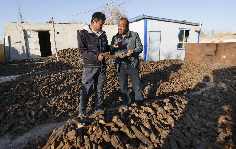2024年12月4日,新疆民豐縣尼雅鎮(zhèn)甫甫克村村民麥麥提(右)同前來收購大蕓的商戶交流。自20世紀(jì)末新疆全面開展防風(fēng)治沙工程并大力推進(jìn)沙產(chǎn)業(yè)以來,麥麥提從在合作社挖大蕓賺工錢,到后來主動(dòng)學(xué)習(xí)大蕓種植技術(shù)并創(chuàng)業(yè),一路走來小有收獲。2018年,他承包了10畝沙地種紅柳、大蕓。紅柳茁壯成長(zhǎng),大蕓產(chǎn)量頗豐,麥麥提年收入超過5萬元。