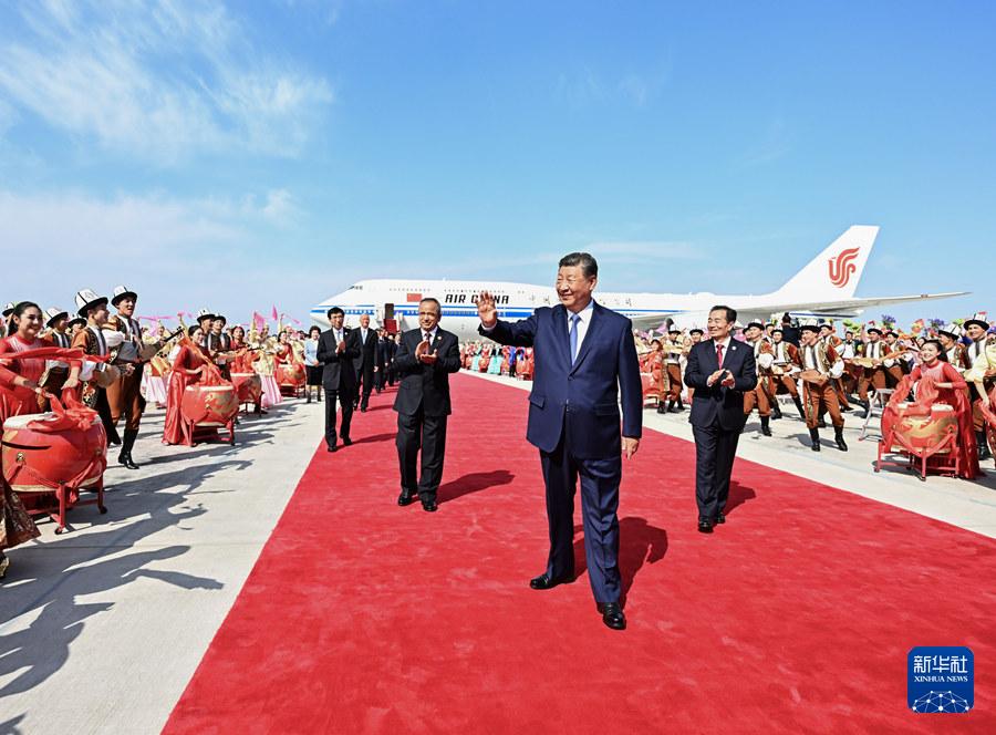 新疆維吾爾自治區(qū)黨委書記陳小江、自治區(qū)人民政府主席艾爾肯·吐尼亞孜、自治區(qū)人大常委會主任祖木熱提·吾布力、自治區(qū)政協(xié)主席努爾蘭·阿不都滿金、新疆生產(chǎn)建設(shè)兵團(tuán)政委何忠友等在舷梯下迎候。習(xí)近平走下舷梯時,少先隊員獻(xiàn)上鮮花。各族群眾代表身著民族服飾,載歌載舞,歡迎總書記的到來,表達(dá)對總書記的衷心祝福。