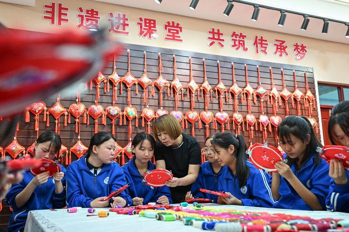 2025年9月26日,內(nèi)蒙古興安盟科右中旗巴彥呼舒第六中學美術教師、非遺代表性傳承人吳斯琴(左四)指導學生刺繡。近年來,內(nèi)蒙古興安盟科爾沁右翼中旗巴彥呼舒第六中學將當?shù)貒壹壏沁z圖什業(yè)圖刺繡引入校園,開設校本課程,并成立興趣社團,在豐富校園文化生活的同時,讓學生們近距離感受非遺的魅力,弘揚和傳承中華優(yōu)秀傳統(tǒng)文化。