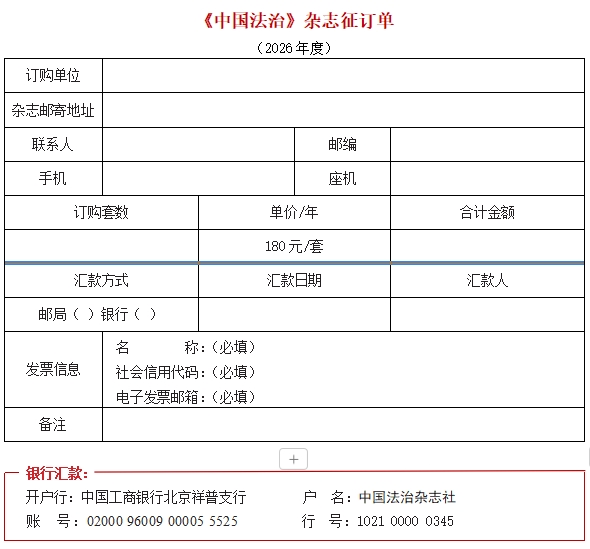③2025年7月起,“中國(guó)司法雜志社”更名為“中國(guó)法治雜志社”。銀行戶(hù)名于2025年8月25日變更,由“中國(guó)司法雜志社”變更為“中國(guó)法治雜志社”,開(kāi)戶(hù)銀行、賬號(hào)、行號(hào)均未變。