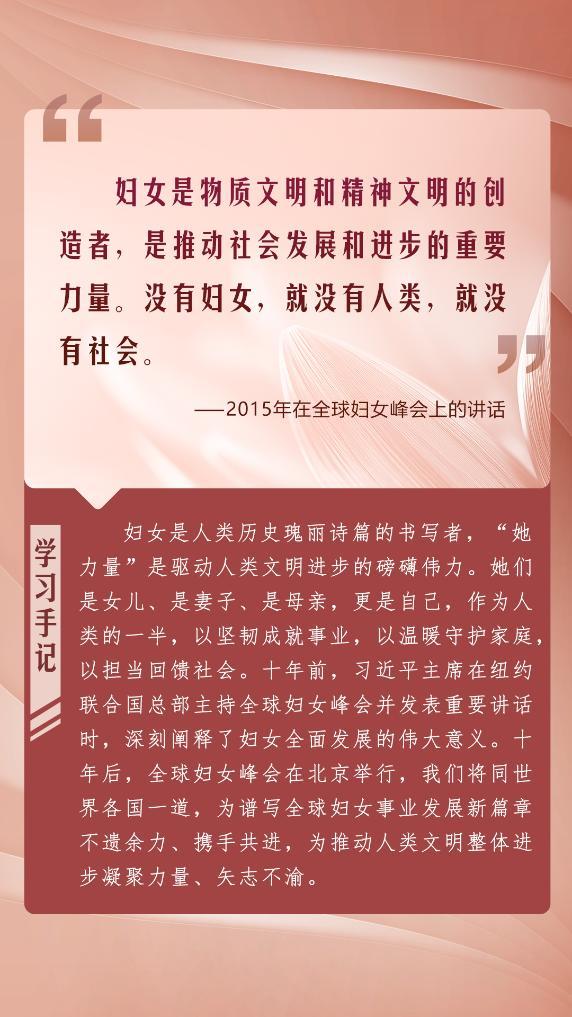 在全球婦女峰會(huì)即將舉行之際,我們重溫習(xí)近平總書記的重要論述,共同展望婦女發(fā)展的美好未來,期待全球婦女事業(yè)發(fā)展譜寫新的絢爛篇章。
