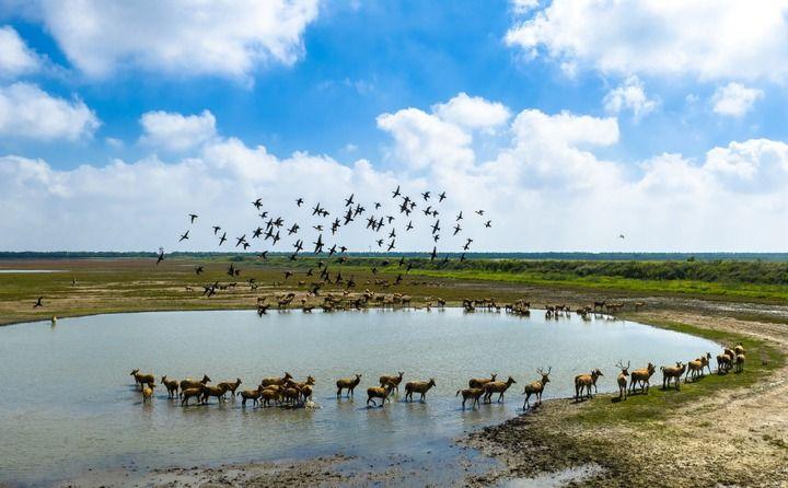 2025年10月11日,在江蘇東臺條子泥濕地,候鳥飛翔,成群野生麋鹿悠閑散步,一派人與自然和諧共生的生態(tài)美景(無人機照片)。新華社發(fā)(孫家錄攝)