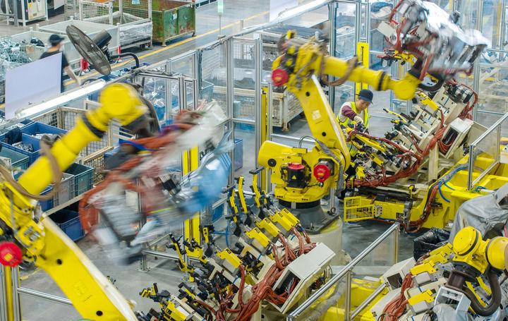 2025年10月9日,浙江省湖州市長興經(jīng)濟技術(shù)開發(fā)區(qū)的長興地通汽車部件有限公司技術(shù)人員操控工業(yè)機器人生產(chǎn)新能源汽車配件(無人機照片)。新華社發(fā)(譚云俸攝)