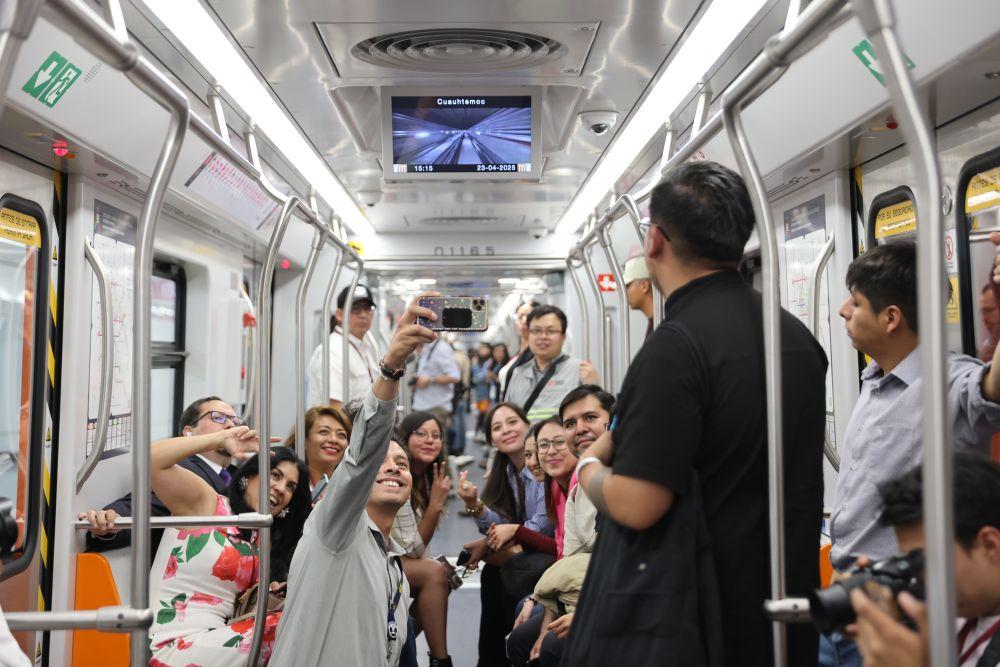 2025年4月23日,在墨西哥首都墨西哥城,媒體記者在地鐵新1號線列車上合影。當(dāng)日,墨西哥城地鐵新1號線舉行部分通車儀式,中國企業(yè)助力全面升級系統(tǒng)設(shè)備,改善市民通勤體驗。