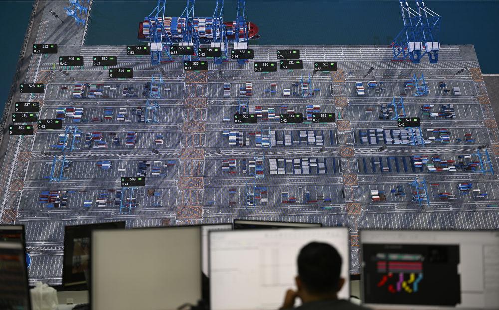 2025年5月16日,在秘魯錢凱港的中遠海運港口秘魯錢凱公司前方運營大樓,工作人員通過屏幕監(jiān)測港口運行情況。錢凱港是中國與秘魯共建“一帶一路”標(biāo)志性項目,2024年11月正式開港,成為連接亞洲與拉美最重要的航運樞紐之一。